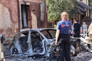 - Bildunterschrift:After air strikes, specialist staff from our partner Malteser Ukraine is quickly on scene to offer relief through psychological first aid.